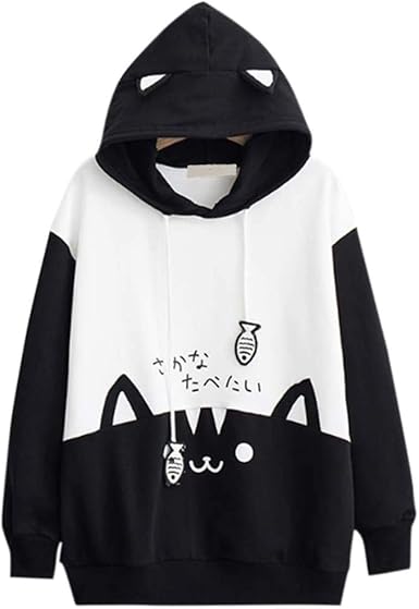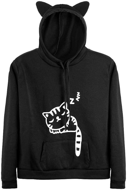 Women Teen Girls Cat Hoodie Sweatshirt Cute Cat Ear Sleeping Cat Printed Pullover Sweatshirt