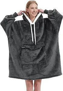 Oversized Wearable Blanket Hoodie, Comfy Sherpa Sweatshirt Pullover Jacket (Large Pocket, Dark Grey, Adult)